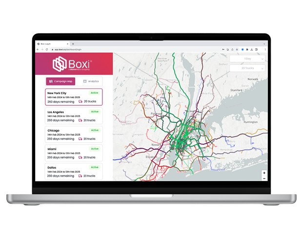 Boxi offers flexible 3, 6, or 12-month campaigns where you choose the number of 26’ box trucks and target any market across the U.S. You’ll define custom routes by ZIP code, and your branded billboard truck advertising will consistently service those areas, making household and business deliveries at least six days a week, 12 hours a day. Operating from sunrise to sunset, these trucks ensure high-frequency exposure, generating tens of thousands of impressions daily. Whether you’re targeting a single city or multiple regions, this model delivers sustained, localized visibility and measurable impact—perfect for achieving a number of client KPI’s such as building mass brand awareness, driving foot traffic to retail locations, and increasing Incremental sales.